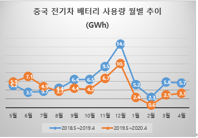 한편, 2020년 1~4월 누적 중국 전기차 배터리 사용량은 9.1GWh로 전년 동기 대비 52.0% 급감했다. 배터리 단위 용량이 큰 BEV를 위주로 1월부터 매달 전기차 판매량이 두 자릿수로 감소했다.