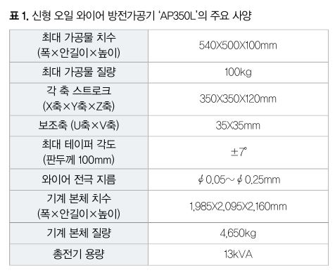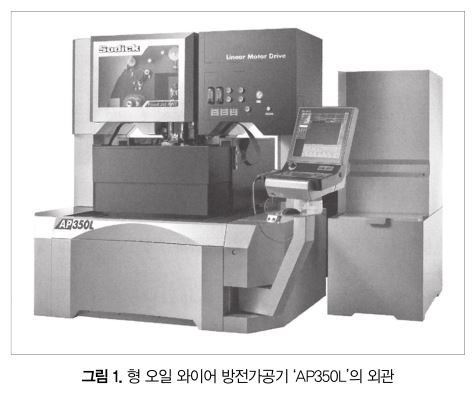 동사는 이번에 리니어모터 구동 초정밀 와이어 방전가공기 AP 시리즈의 라인업으로서 오일 방전가공기 AP350L을 개발했다(그림 1, 표 1). 이 AP350L은 사이즈가 지금까지의 AP250L과 AP450L의 중간에 위치, 고객에 대한 선택지로서 요구에 대응하는 것을 목적으로 개발했다.