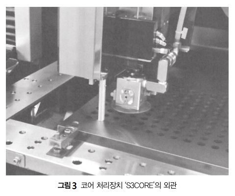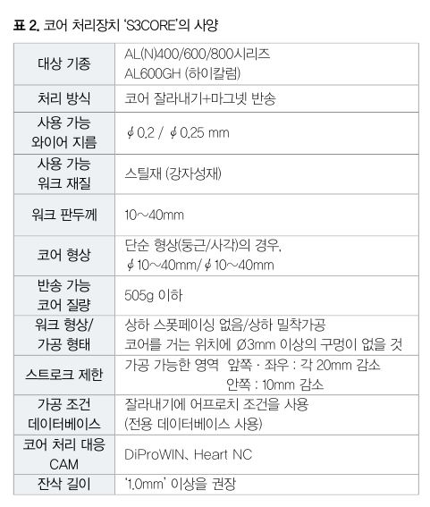 동사는 물 와이어 방전가공기 AL 시리즈용 새로운 코어 처리장치로서 S3CORE를 개발했다(그림 3, 표 2). 이 S3CORE는 가공 후의 코어를 자동으로 회수하는 장치로, 자동화에 크게 공헌할 수 있다.