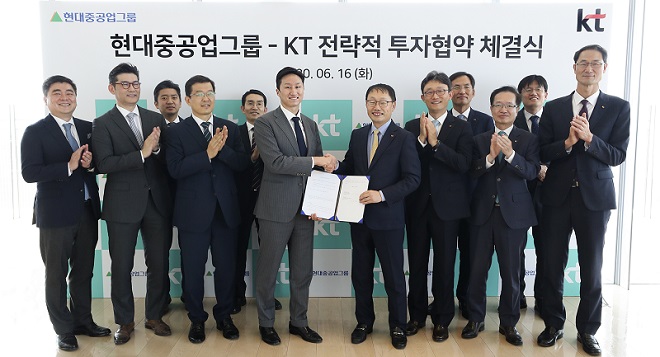 ▲현대중공업그룹과 KT그룹이 6월 16일 서울 종로구 KT광화문빌딩 East에서 전략적 투자협약 체결식을 가졌다.(앞줄 왼쪽에서 세번째부터)현대로보틱스 서유성 대표, 현대중공업지주 정기선 경영지원실장, KT 구현모 대표, KT 박윤영 기업부문장
