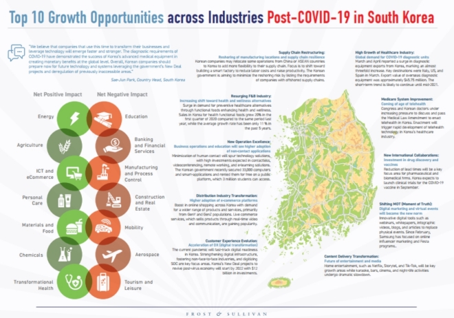 프로스트 앤드 설리번은 코로나19에 긍정적인 영향을 받을 것으로 기대되는 산업에는 의료와 화학, 소재, 식품, IT, 에너지 산업을, 부정적인 영향을 받을 것으로 우려되는 산업에는 교육과 금융, 제조, 건설, 자동차, 항공, 관광 산업을 꼽았다.