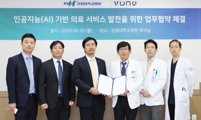 강원대학교병원은, 29일 인공지능 솔루션 개발 기업 뷰노와 AI 기반 의료 서비스 개발 MOU 체결하며 정밀의료 분야 첫발을 뗐다. 이날 협약에는 강원대병원 이승준 원장과 뷰노 김현준 대표집행임원 등 양측 관계자들이 참석했다.