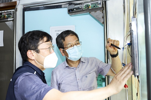 ▲기계연구원 로봇메카트로닉스연구실 함상용 책임기술원(오른쪽)과 지역 중소기업 세이인 백진기 대표(왼쪽)가 로봇기술을 활용한 전용 모션 제어기술의 밸런스 도어 적용 방안을 논의하고 있다.
