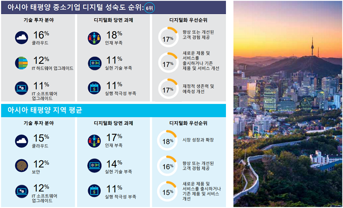디지털화 우선 순위를 살펴보면, 한국 중소기업들은 고객 경험 향상 및 개선(17%), 새로운 제품/서비스 론칭 또는 기존 제품/서비스 개선(17%), 재정적 생존력 및 예측성 개선(17%)을 최우선 과제로 꼽았다. 반면 아태 지역 중소기업들의 경우 시장 성장과 확장(18%)을 우선순위로 꼽으며 시장 전체 성장에 주목하는 것으로 나타났다.
