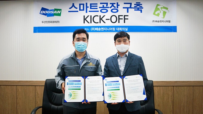 ▲두산인프라코어 구매총괄 이용진 전무(사진 오른쪽)와 해송엔지니어링 류경환 대표가 프로그램 양해각서를 체결한 후 기념사진을 촬영했다.