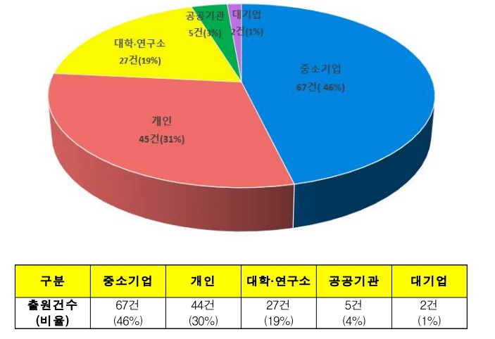 최근 5년간(’15∼’19년) 특허출원 동향을 출원인 유형별로 살펴보면, 중소기업이 46%(67건)을 출원하여 가장 많은 비중을 차지했다. 이는 영상처리 기술을 바탕으로 CCTV 관련 제품을 생산하는 중소기업의 기술 개발이 활발하기 때문인 것으로 보인다. 그 다음으로 개인 30%(44건), 대학·연구소 19%(27건), 공공기관 4%(5건), 대기업 1%(2건) 순으로 나타났다.