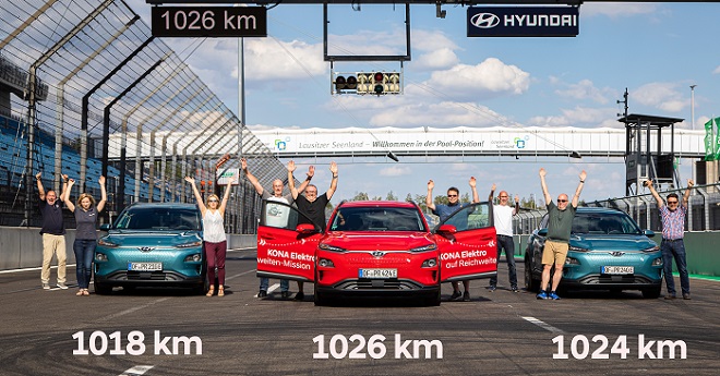 현대차는 코나 일렉트릭 3대가 7월 22일부터 24일까지 독일에서 실시된 시험주행에서 각각 1026km, 1024.1km 그리고 1018.7km의 주행거리를 달성했다고 8월 14일 밝혔다. 시험에서 연비는 1kWh당 16km 안팎으로 나타나 국내 기준 공인 전비(전기차 연비)인 5.6 km/kWh를 훌쩍 뛰어넘었다.