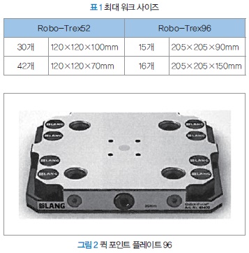 로보트렉스는 로보트렉스 52와 로보트렉스 96 등의 2종류가 있다. 표 1은 랑사 제품의 기초가 되는 퀵 포인트 플레이트(그림 2)의 매크로 그립(그림 3) 설치 피치 사이즈이다. 로보트렉스 52는 1대의 트롤리(그림 4)에 대해 30개 혹은 42개의 매크로 그립 탑재, 로보트렉스 96은 1대의 트롤리에 대해 15개 혹은 16개의 매크로 그립 탑재가 가능하다.