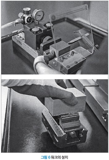 ‘퀵 포인트 테크놀로지’는 퀵 포인트 플레이트라는 세팅 효율을 개선하는 탈착을 간단히 할 수 있는 플레이트를 이용하고 있는 것이다. 동일한 장착구 중에서도 가장 낮은 높이 27mm로 되어 있으며, 원형, 사각 등 다양한 라인업을 갖추고 있다. 또한 퀵 포인트 플레이트는 첫 1회만 머시닝센터의 테이블에 설치(심내기 포함)를 하면, 첫 회 이후의 매크로 그립 등의 세팅을 반복 5μm로 할 수 있다. 그 때의 클램프/언클램프는 1군데의 나사 고정으로 되어 있으며, 간이적으로 세팅이 가능하다(그림 5).