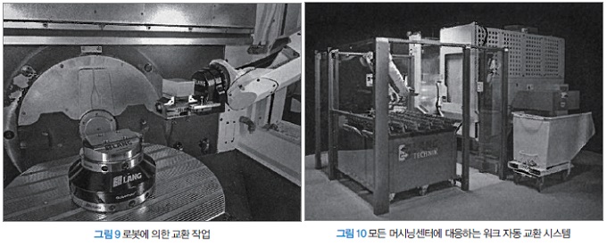 로보트렉스는 기존의 설비에 대해 추가로 설치할 수 있게 되어 있으며, 최근에는 6축 로봇을 사용함으로써 워크 반송의 자유도가 확대되고 있다(그림 8). 트롤리식을 채용함으로써 재료의 운반 등 세팅 전환 효율이 높아지고, 공감절감이면서 대용량의 스토리지를 실현한다. 머시닝센터 내에 설치하는 방법으로는 신뢰성이 있는 랑사의 매크로 그립/퀵 포인트 플레이트를 사용하고 있으며, 로봇으로도 간이적으로 교환이 가능하다(그림 9). 더구나 로보트렉스는 모든 메이커의 공작기계와 접속이 가능하다. 필요한 것은 자동 개폐식의 문과 M 코드 사용의 인터페이스 이용으로 매우 심플하다.