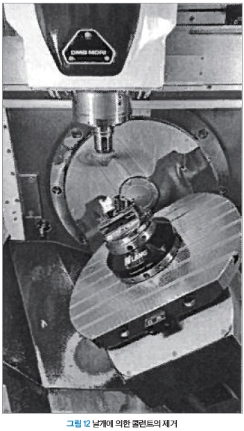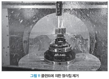랑사는 독자적으로 개발한 클린 테크가 있는데, 미리 ø20의 섕크에 세트해 ATC 중에 설치하고 가공 종료 후에 센터 스루 쿨런트를 사용해 절삭칩을 떨어트리고(그림 11), 그 후 4개의 날개를 스핀들 회전(원심력)을 이용해 날개를 펼쳐 바람을 일으키고 쿨런트 제거를 해 클린한 워크 교환을 할 수 있다(그림 12). 그렇기 때문에 자동 운전으로도 클린한 상태로 운용이 가능하다. 또한 자동화가 아니라, 수동 생산을 하는 경우에도 매크로 그립은 다른 기계에서 언제나 사용할 수 있고, 생산의 유연성, 범용성을 항상 갖게 할 수 있다.