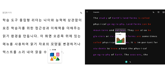 한국어를 포함해 70개 이상의 언어로 번역을 지원, 단어를 소리 내어 읽어 준다. 색깔 구분을 통해 명사, 동사, 형용사 등의 단어를 강조하고 그림과 같은 시각적인 요소로 학습자의 문장 이해도와 집중도 향상에 도움을 준다. 이러한 기능은 방정식 등 어려운 수학 문제를 푸는데도 적용되어 학생들의 문제 풀이 능력 향상을 위한 훈련을 지원한다.