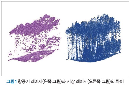 항공기 레이저는 센서를 항공기에 탑재하고 조사하는 타입으로, 국가나 도시 등의 광역 바이오매스량 추정에 가장 효과적인 방법이다. 항공기 레이저는 산림 내의 지반 높이를 측정할 수 있기 때문에 방재나 지형 분야에서 가장 많이 이용되고 있다. 고도가 높은 항공기에서 레이저를 조사하기 때문에 수관 상부(수목 상부)에서 반사가 많아, 산림 내부의 줄기 상황은 정확히 파악할 수 없다(그림 1). 특히 바이오매스량 측정에 필요한 줄기 형상을 정확하게 파악할 수 없다. 이러한 문제를 해결할 수 있는 것이 지상 레이저이다.