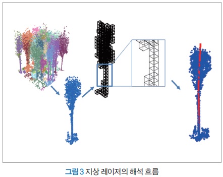 필자는 지상 레이저를 이용해 정확한 바이오매스 측정을 비파괴로 하는 기술을 확립했다. 분석 기법은 센서를 산림 내에 설치, 고밀도 데이터를 취득한다(그림 2). 취득된 데이터는 가지고 돌아와 사무실에서 해석 작업을 한다. 취득한 지상 레이저의 점군에서 단목 단위로 점군을 추출한다. 단목 단위의 점군에서 수목 줄기부를 자동 판별, 줄기체적(재적)을 자동으로 계산한다(그림 3).