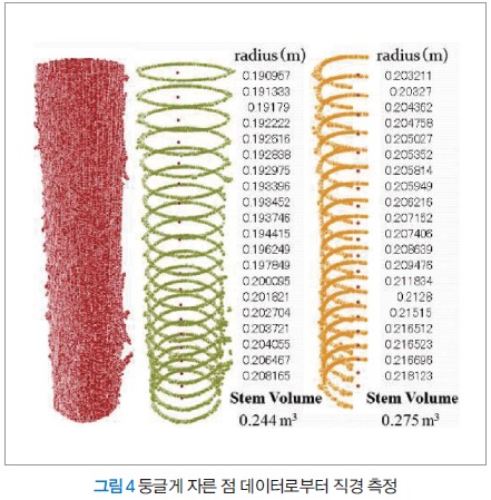 지상 레이저에서 얻은 점군은 지상에서 반사되는 점만을 분류할 필요가 있다. 필터링 기술을 독자적으로 개발, 지반에서 반사된 점만을 이용해 DTM(Digital Terrain Model)을 작성한다. 작성된 DTM을 이용해 수관 높이를 나타내는 DCM(Digital Canopy Model)을 작성, Watershed법이라는 분류법을 적용하면 단목 단위의 수관 범위를 자동으로 분류해 점군을 추출한다(그림 3). 줄기부만의 데이터에서 50cm 간격으로 높이별로 줄기부 데이터를 둥글게 자르고, 둥글게 자른 데이터에서 줄기 직경을 자동으로 측정한다. 50cm 간격으로 측정한 결과로부터 체적을 산출하고, 수목 1개의 줄기체적으로 한다(그림 4). 측정에는 뉴럴 네트워크 기술을 이용했다. 이러한 일련의 분석 기법을 자동화하고 있으며, 줄기재적을 자동으로 산출할 수 있게 했다. 소프트웨어로서 패키지화되어 있기 때문에 올해 안에 이용 가능하다. 소프트웨어의 이용 희망자는 필자에게 연락하기 바란다.