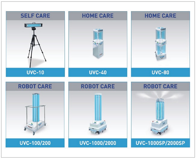 대차용으로 제작된 UVC-100/200은 ‘로봇 케어’ 제품군 중 수동 타입의 이동형 모델이다. UVC 램프가 41W/65W 두 가지 타입으로 적용됐다. 기본 내장형 타이머와 리모컨을 통해 ON/OFF할 수 있으며, 추후 자율주행 살균로봇으로 업그레이드 개조가 가능하다는 장점이 있다.