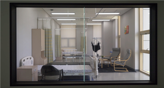 ▲스마트 안전 리빙랩에는 실사용자의 반응을 거울 반대편에서 관찰할 수 있는 관찰실이 구축되어 있다. (해당 사진은 관찰실에서 바라본 요양원 리빙랩 내부 모습)