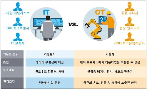 지난 10년 동안 산업 네트워크 환경에서도 지속적으로 사이버공격을 받아왔으며 피해 규모가 커가고 있다(그림 1). 또한, 그림 2와 같이 IT와 OT의 차이로 기업 네트워크를 보호하기 위한 접근법이 산업네트워크에는 적용되기 어렵다. 따라서 산업사이버 보안에 대한 포괄적인 이해를 통해 네트워크를 보호하기 위해서는 전체적인 접근방식을 취해야 된다.