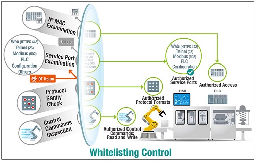 또한, 권한이 없는 명령이 산업용 IPS 또는 방화벽을 통과하지 못하도록 승인된 프로토콜 형식을 정의할 수도 있으며, OT 엔지니어는 잘못된 제어 명령을 보내는 것과 관련된 인적 오류(휴먼에러)를 줄이기 위해 네트워크를 통과할 수 있는 제어 명령을 정의할 수도 있다.