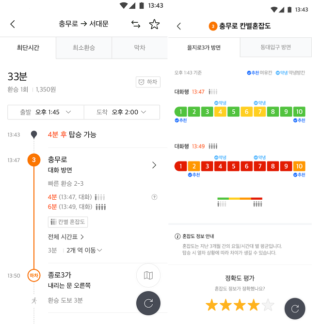‘초록’은 승객이 칸 내 여유로운 상태를, ‘빨강’은 서 있는 승객들의 어깨가 밀착돼 이동이 불가능한 상태 등을 나타낸다. 또한 모든 칸이 같은 혼잡도 단계일 경우, 조금이라도 더 여유 있는 두 개의 칸을 알려주는 ‘추천’ 기능을 적용했다.