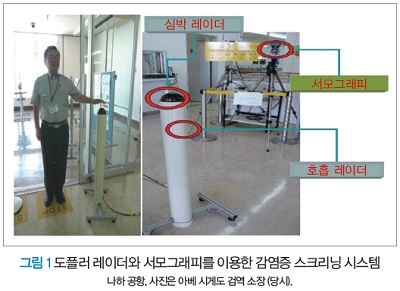 수도대학도쿄(현 도쿄도립대학)의 경영공학을 전공하는 학생들과 함께 개발해 나하 공항에 시험적으로 설치한 감염증 스크리닝 시스템을 그림 1에, 감염증 스크리닝 실시 화면을 그림 2에 나타냈다. 검은 원통 모양의 부분에 손바닥으로부터 맥을 측정하기 위한 도플러 레이더 혈류계를 설치하고, 크림 모양의 통 부분에는 흉복부의 움직임으로부터 호흡수를 측정하기 위한 10GHz의 소형 도플러 레이더를 설치했다. 서모그래피는 나하 검역소의 서모그래피를 이용했다. 당시 연구비가 거의 없었기 때문에 모두 학생들이 직접 만들었다.