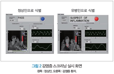 그림 2는 해외에서 들어온 여행객의 스크리닝 실시 화면이다. 5초의 측정 시간 동안 왼쪽의 정상인에서는 발열이 확인되지 않고 심박수와 호흡수가 비교적 낮은 값을 보인 반면, 오른쪽의 유병인에서는 발열(빨간 부분 얼굴 표면 온도>35.4℃ 체온=얼굴의 표면 온도+1.6℃)이 확인되고 호흡수, 심박수도 정상인에 비해 높은 값을 나타냈다. 유병 여부의 판단은 비접촉으로 구한 호흡수, 심박수, 얼굴 표면 온도를 설명변수로 하는 선형판별식을 이용하는 매우 심플한 알고리즘을 이용하고 있다. 검역소의 간호사가 확인한 결과, 오른쪽의 유병인은 발열을 포함한 감기 증상을 보이고 있었다. 측정 시간을 5초로 제한했지만, 이동 시간을 포함해 1인당 9.2초의 시간이 걸렸다. 목표한 1인당 3.6초에는 훨씬 미치지 못했지만, 이와 같은 1인씩 측정하는 시스템에서는 1인당 9.2초의 측정 시간은 거의 한계에 가깝다고 생각된다. 1인당 검사 시간은 10초 이하였지만, 1대의 시스템으로 150인승의 중형기 탑승자 전원의 스크리닝을 하면 30분 가까이 걸리므로 여러 개의 시스템을 동시에 운용하는 것이 바람직하다. 콜레라 이외의 감염증이 발병하면, 체온, 호흡수, 심박수의 상승이 확인된다. 이 시스템은 감염증 발병에 따르는 바이탈 사인의 변화를 감지하기 위한 것으로, 잠복기 환자의 스크리닝에는 이용할 수 없다.