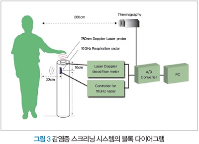 (1)을 실현하기 위해 마이크로파 레이더를 이용한 호흡과 심박의 비접촉 측정, 서모그래피를 이용한 체온의 비접촉 측정을 실시했다. 또한, 2차 오염이 예상되는 가장 일반적인 질병이 감염증이었으므로, 전신성 염증반응증후군(Systemic In fl ammatry Response Syndrome : SIRS)의 진단 기준 중 비접촉으로 측정 가능한 호흡수, 심박수, 체온을 측정해 SIRS 발병의 유무를 판정하기로 했다. SIRS는 패혈증 환자가 다발성 장기 부전으로 이행했는지의 여부를 판단하는 기준으로, 증상이 없어지는 환자와 더욱 위독해지는 환자를 예상하는 지침이었다. SIRS의 판정은 각 지표마다 판정의 임계값이 정해져 있다. 단, SIRS의 판정을 하기 위한 각 지표는 성인을 대상으로 하고 있어 어린이에게는 적용할 수 없으며, 또한 비접촉으로 측정할 수 없는 지표도 있기 때문에 이 임계값을 이용하지 않고 선형판별에 의해 감염군과 비감염군을 구하기로 했다. 이렇게 방위의과대학교에서는 SIRS의 비접촉 진단법 연구를 실시했지만, 시스템 개발에 이르지는 못했다.