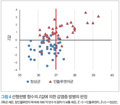 Z(X₁, X₂, X₃)의 부호가 마이너스일 때, 감염 의심, 플러스일 때, 정상인으로 판정한다. 이 식에 의해 구한 Z값과 체온의 관계를 그림 4에 나타냈다. ●이 정상인, ▲이 유병인(인플루엔자 환자)를 나타내고 있다. 일부에 오검출도 확인되지만, 37℃ 이하의 보통 체온의 유병인도 포함해 비교적 정확하게 판별되어 있다. 타미플루와 리렌자 등 항인플루엔자 약을 투여 받았기 때문에 보통 체온의 환자가 많았음에도 불구하고, 비교적 고정밀도로 정상인과 인플루엔자 환자를 판별하는 것에 성공했다. 스크리닝의 정밀도를 나타내는 감도는 89%로, 항인플루엔자 약 복용에 의해 보통 체온의 환자가 많은 점을 감안하면 이 감도는 상당히 가치가 있다. 항인플루엔자 약 복용에 의해 체온은 보통으로 돌아왔어도 아직 증상이 없어진 것은 아니므로 호흡수나 심박수는 곧바로 정상치로 돌아오지 않기 때문이다.