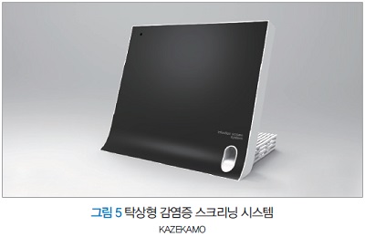 그림 5에 10대의 시제작한 탁상형 감염증 스크리닝 시스템을 나타냈다. 나리타공항 검역소에서 사용하지는 못했지만, 나리타 국제공항 클리닉(일본의과대학)에서 시험 운용을 했다. 이 시스템은 실용화를 생각해 코스트 다운을 도모했다. 서모그래피 대신에 서모바일 어레이(왼쪽 위)를 이용하고, 호흡수는 24GHz의 도플러 레이더(아래 중앙), 심박수는 비접촉으로도 측정 가능하지만, 안정성과 코스트를 생각해 광전맥파 센서를 이용했다. 제품 디자인은 SAMUSUNG의 디자이너 경험이 있는 도쿄도립대학의 김석진 선생이 맡아 주었다.