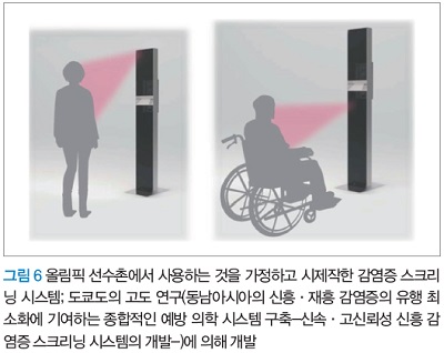 또한, 도쿄 올림픽 선수촌에서 사용하는 것을 가정해 그림 6에 나타낸 시스템을 도쿄도의 고도 연구(동남아시아의 신흥·재흥 감염증의 유행 최소화에 기여하는 종합적인 예방 의학 시스템 구축-신속·고신뢰성 신흥 감염증 스크리닝 시스템의 개발-)의 지원을 받아 시제작했다. 즉, 직사각형의 세로 길이로 상부와 하부에 독립된 2개의 감염증 스크리닝 시스템을 내장, 상부의 시스템에서 서있는 선수에 대응하고, 하부의 시스템에서 앉아 있는 선수의 감염증 스크리닝을 한다. 표준적인 측정 시간은 10초를 예상하고 있다.