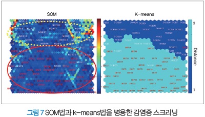 선형판별법은 올림픽 선수촌이나 공항 검역과 같은 다양한 연령, 다양한 질환의 환자가 모이는 장소에서는 충분한 제도를 보장할 수 없다. 그렇기 때문에 항상 최적의 스크리닝 조건을 자동적으로 갱신하는 알고리즘을 개발했다. 뉴럴 네트워크의 일종인 SOM법과 k-means법을 병용한 스크리닝법이다(그림 7). 우선 SOM법을 이용해 각 피검자의 심박수, 호흡수, 얼굴 표면 온도에서 각 피검자의 거리(Umatrix distance)를 구한다. 그 결과, SOM법에 의해 연속적인 매우 많은 계층으로 분류된다. 감염증의 스크리닝에서는 보통 유병인군(감염군)과 정상인군의 2군으로 분류하는 것이 요구되므로 k-means법을 이용해 이 거리(U-matrix distance)를 기초로 2군으로 분류한다. 선형판별 함수와 비교해 이 방법의 장점은 이하의 두 가지이다.