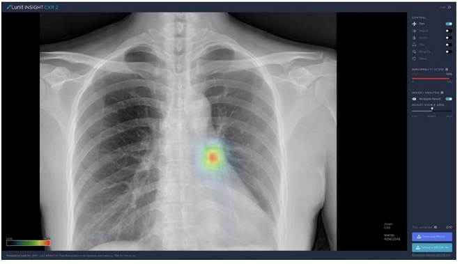 ▲루닛의 폐 질환 진단 보조 AI 소프트웨어인 ‘루닛 인사이트 CXR’로, 인공지능을 활용해 흉부 엑스레이의 비정상 소견을 표시한다.