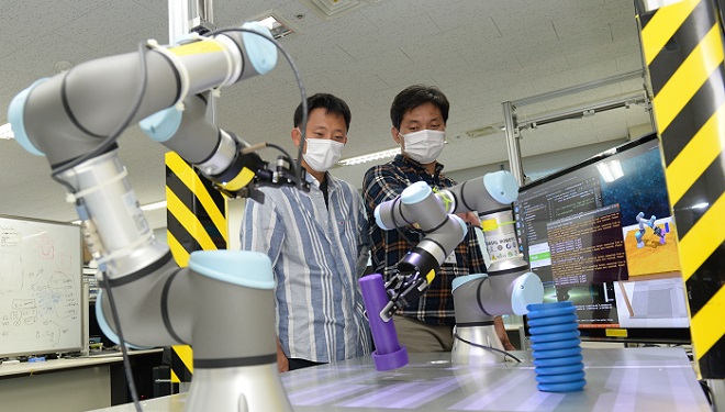 ▲ETRI 연구진(왼쪽부터 한효녕 선임연구원, 김현석 선임연구원)이 개발한 스마트팩토리용 로봇 자율지능 기술을 점검하는 모습