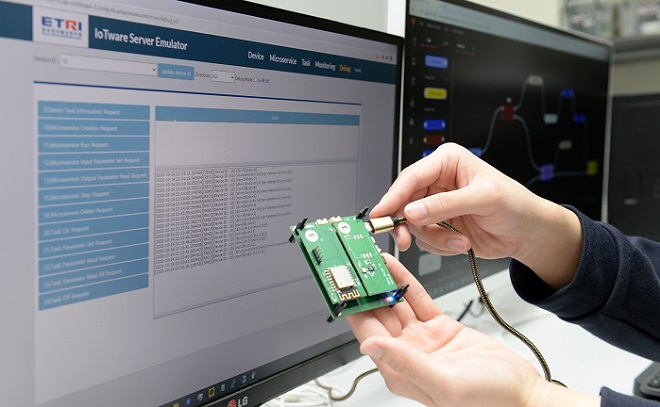 아울러, ETRI는 IoT기기의 개발환경도구인 IoT웨어-IDE를 개발, ▲드래그 앤 드롭 그래픽 프로그래밍 ▲개발자 협업 프로그래밍 ▲코드 전력소모 패턴 분석기 등도 지원한다. 이로써 기존 서너 달 걸리던 프로그램을 일주일 내 짤 수 있다는 게 연구진의 설명이다.