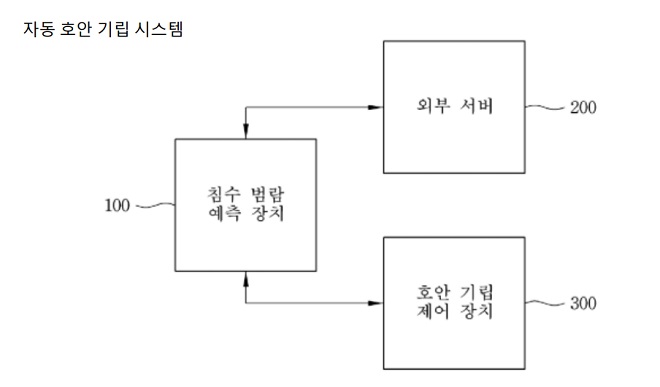 외수위를 고려해 수압에 따라 기립하는 기존 구조물과 달리 태풍 해일에 의한 수치예측 결과(해일고 또는 월파에 의한 침수가능 높이)가 자동 호안 기립의 평상시 천단고 보다 높게 나와 월파/범람/침수의 피해 발생이 예측될 경우 자동으로 호안을 기립시킴으로써 월파/범람/침수 피해를 방지한다.