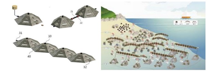 그리고 치어 및 치패 생장을 위한 최적 구조물로 활용해 근해용 해중림 조성 구조물로서 적합한 다양한 다각형구조로 변형이 가능하며 치어나 치패(어린조개)가 천적을 피해 은신하기 용이하도록 설계할 수 있다.