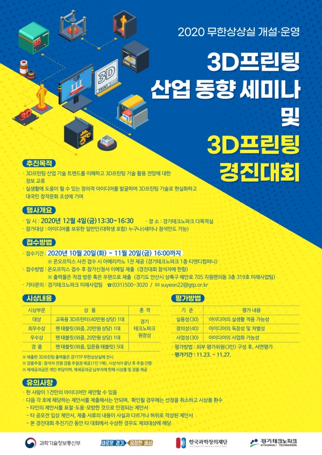 한편, 대회 후 진행되는 시상식에서는 대상과 최우수상, 우수상 순으로 수여되며, 제출한 3D프린팅 출력물은 경기TP 무한상상실에 전시될 예정이다.