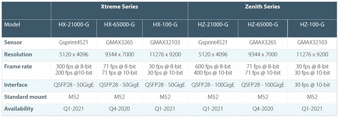 HX-21000-G 및 HZ-21000-G는 Gpixel의 21MP인 Gsprint4521 센서를 탑재하여 풀해상도 5120 x 4096에서 50GigE 모델의 경우 최대 300fps, 100GigE 모델의 경우 최대 600fps를 얻을 수 있다. HX-100-G와 HZ-100-G는 모두 103.7MP GMAX32103 CMOS 센서를 사용하고 풀해상도 11276 x 9200, 8bit 모드에서 초당 30 프레임을 얻는다. 103.7MP 모델은 2021 년 1분기에 출시될 예정이다.