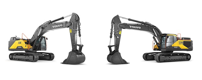 ▲볼보건설기계가 11월 24일부터 27일까지 건설기계 전시회 ‘바우마 차이나 2020’에서 선보인 표준형, 험지용 굴착기 신모델 2종(좌 EC380 표준형, 우 EC380 험지용 굴착기) <사진제공 : 볼보그룹코리아>