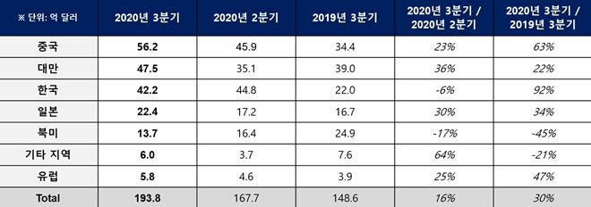 한국의 경우 전 분기인 2분기 대비 반도체 장비 매출액이 약 6% 줄었지만 전년 동기 대비는 무려 92%가 상승했다. 다음으로는 일본, 북미, 기타 지역 및 유럽이 뒤를 이었다.