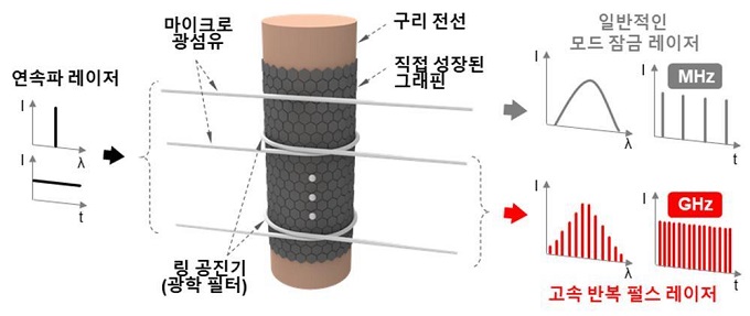 특히 지름 1㎜의 구리 전선 표면에 직접 그래핀을 형성시키고 그 위에 광섬유를 감아 공진기로 사용함으로써 기존의 그래핀 제조·분리·이동 과정에서 그래핀이 손상되거나 이물질이 유입돼 효율이 떨어지는 문제를 해결했다.