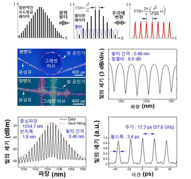 이렇게 만든 펄스 레이저는 반복속도 57.8㎓로 기존 광섬유 기반 펄스 레이저의 한계인 메가헤르츠 수준을 1만배 이상 뛰어넘는 성능을 보였다. 또 소자에 레이저를 추가로 가하면 그래핀의 광열효과에 의해 반복속도를 1.5㎓ 더 높일 수 있는 것으로 나타났다.