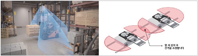 ▲ RGV(Rail Guided Vehicle)의 일정한 거리 간격 유지 및 충돌 방지
