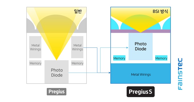 기존의 Pregius 이미지 센서는 메탈 와이어링의 빛 간섭으로 인해 포토다이오드가 빛을 온전히 받을 수 없었다. Pregius S는 그림2와 같이 포토다이오드와 메탈와이어링의 위치를 바꾼 BSI (Back Side Illumination) 설계를 적용해 이전 Pregius 이전 세대보다 이미지 품질을 대폭 개선했다.