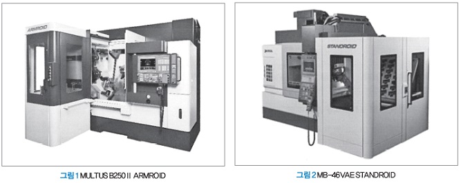 ‘STANDROID’는 6축 다관절 로봇과 워크 스토커를 패키지화한 공간절감형으로, 설치, 이설이 용이한 로봇셀이다. 수직형 머시닝센터 ‘MB-46V’를 비롯한 4기종에 적용하고 있으며, 또한 5축 제어 수직형 머시닝센터 ‘MU-4000V’, ‘MU-S6000V’로도 전개해 복잡한 워크 형상의 공정집약과 생산 자동화에 기여한다.