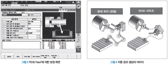 또한 ‘ROID 시리즈’의 특징인 자동 경로 생성 기능에 의해 공간절감형 셀 중에서도 로봇 동작 교시 작업을 간략화할 수 있다. 그렇기 때문에 시스템 기동뿐만 아니라, 세팅 교체나 가공 품종 변경 시에도 최소한의 작업으로 세트업을 완료할 수 있는 작업자에게 친화적인 시스템 구성이다.