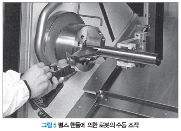 ‘ROID 시리즈’의 로봇은 기계의 조작반에서 동작 설정을 할 수 있고, 교시 동작 시에는 기계 조작으로 사용하는 펄스 핸들을 이용해 수동 조작을 할 수 있다(그림 5). 이와 같이 기계와 로봇 쌍방의 조작성을 겸비함으로써 새롭게 전문 로봇 조작을 익힐 필요가 없으며, 기계와 동일한 좌표로 기계 조작의 연장선상의 조작감으로 로봇을 사용할 수 있으므로 쉽게 로봇 조작이 가능하다.