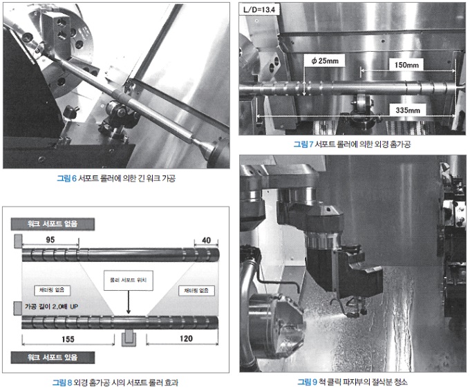 한 예로서 일반적으로 진동방지장치 없이 채터링이 발생하지 않게 가공할 수 있는 기준은 L/D가 10배(길이 [L]와 지름 [D]의 비율) 정도인데, 서포트 롤러를 사용함으로써 L/D를 18배까지 채터링 없이 정밀하게 가공할 수 있다(그림 6). 또한 외경 홈가공에서는 소재 지름 ø25mm, 길이 335mm의 긴 워크(L/D=13.4)에서 워크 중앙부까지 가공 가능한 사례(그림 7, 그림 8) 등 적용 범위의 가능성을 가지고 있으며, 다품종 워크의 자동화에서 안정된 가공이 가능하다.