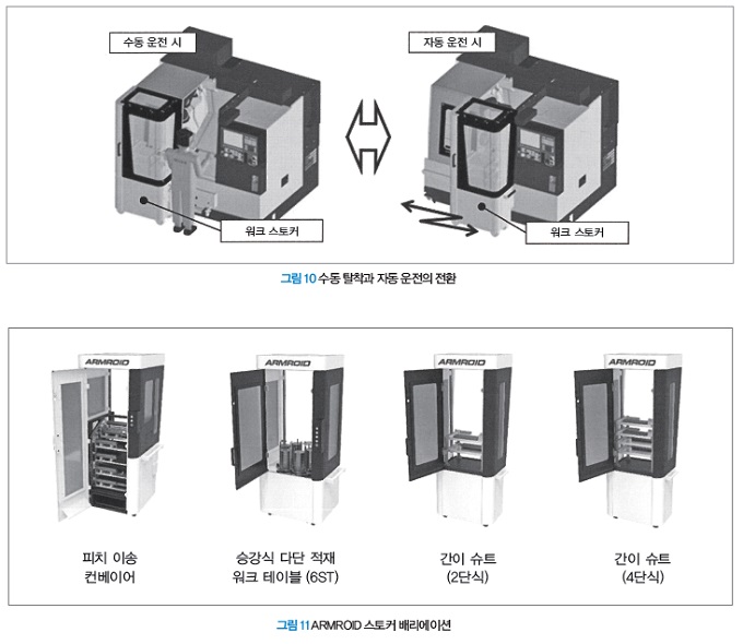 ‘ARMROID’는 스토커를 기계 전면에 설치, 세팅 교체나 공구 교환 시에는 스토커를 왼쪽으로 슬라이드 이동시키는 구조에 의해, 전면 도어 앞의 작업 공간을 확보하는 레이아웃으로 되어 있다(그림 10). 이것에 의해 주간에는 작업자가 세팅 교체 작업이나 첫 부품가공 후의 치수 정밀도 확인 작업 등을 하고, 야간에는 연속가공으로 생산 효율을 향상시키는 운용도 가능하다. 워크 탈착 작업은 ‘ARMROID’가 스토커 상에 워크를 보내기 때문에 작업자는 편한 자세로 스토커 상의 워크 교환 작업만을 하므로 작업자의 부담 경감 등 유저의 생산 방식에 따른 다양한 운용도 가능하다.