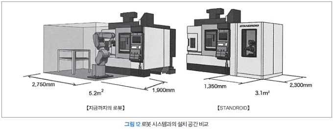 ‘STANDROID’는 기존의 로봇 시스템에 대해 약 60%까지 로봇 설치 공간을 축소, 현재의 가공 설비에서 최소한의 공간 확장으로 자동화 설비 도입이 가능하다(그림 12).